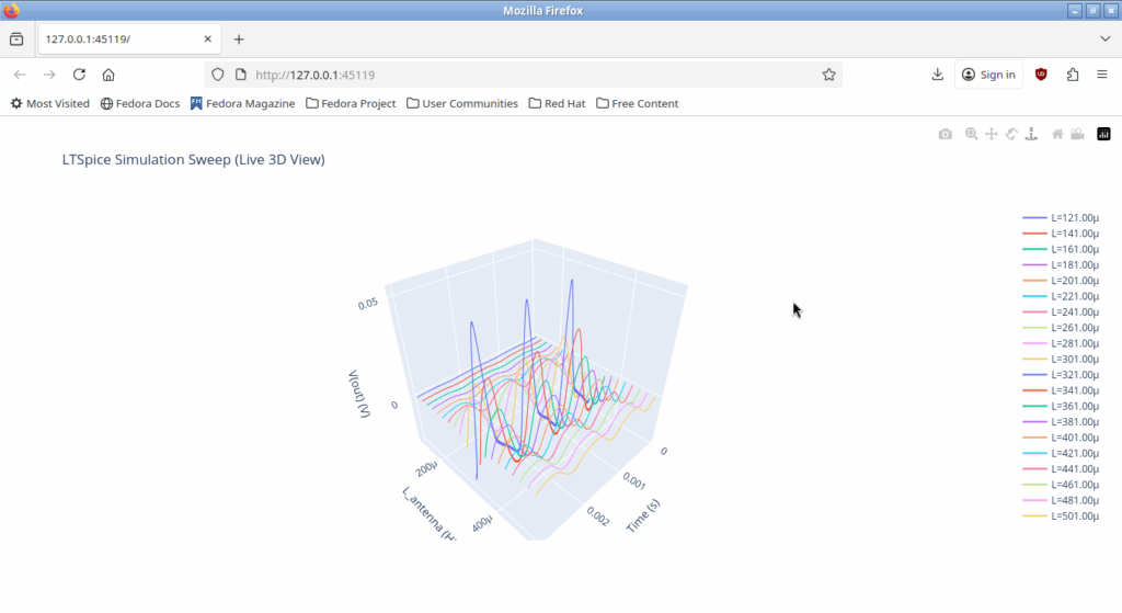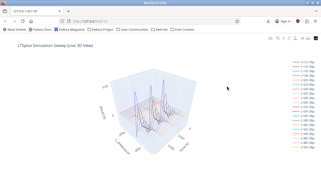 For the simulation I used a Fedora VM, with LTspice running in Wine and simulation controlled externally via PyLTSpice library. Only L value was varied, to simulate the scanning. I left the equivalent series resistor constant (12.67Ω, measured with NanoVNA at 1151MHz, without the ferrite bar), since it doesn’t change that much inside the AM band frequency range.