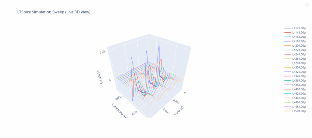 The RF frontend seem easy enough to try to have it in LTspice, and I have to admit, I spent way too much time trying various ways to simulate the RF input coming from the antenna. After a while, I got the idea of trying a 3D plot of the selectivity of the radio. LTspice does offer have a flat view and makes it easy to do a parameter sweep (such as the L value of the antenna, simulating a “band scan”), but what about in 3D ?