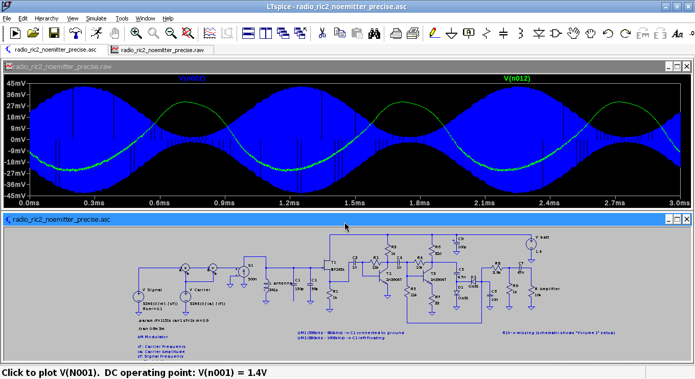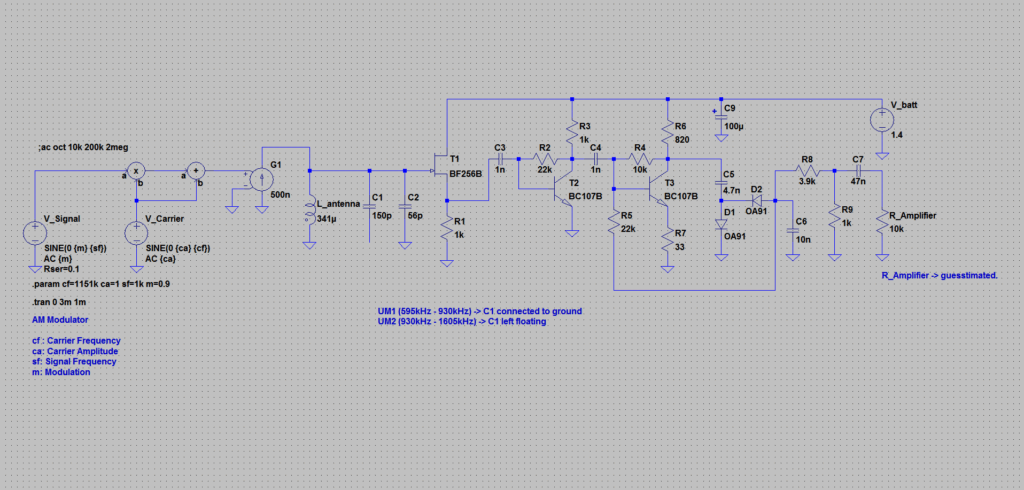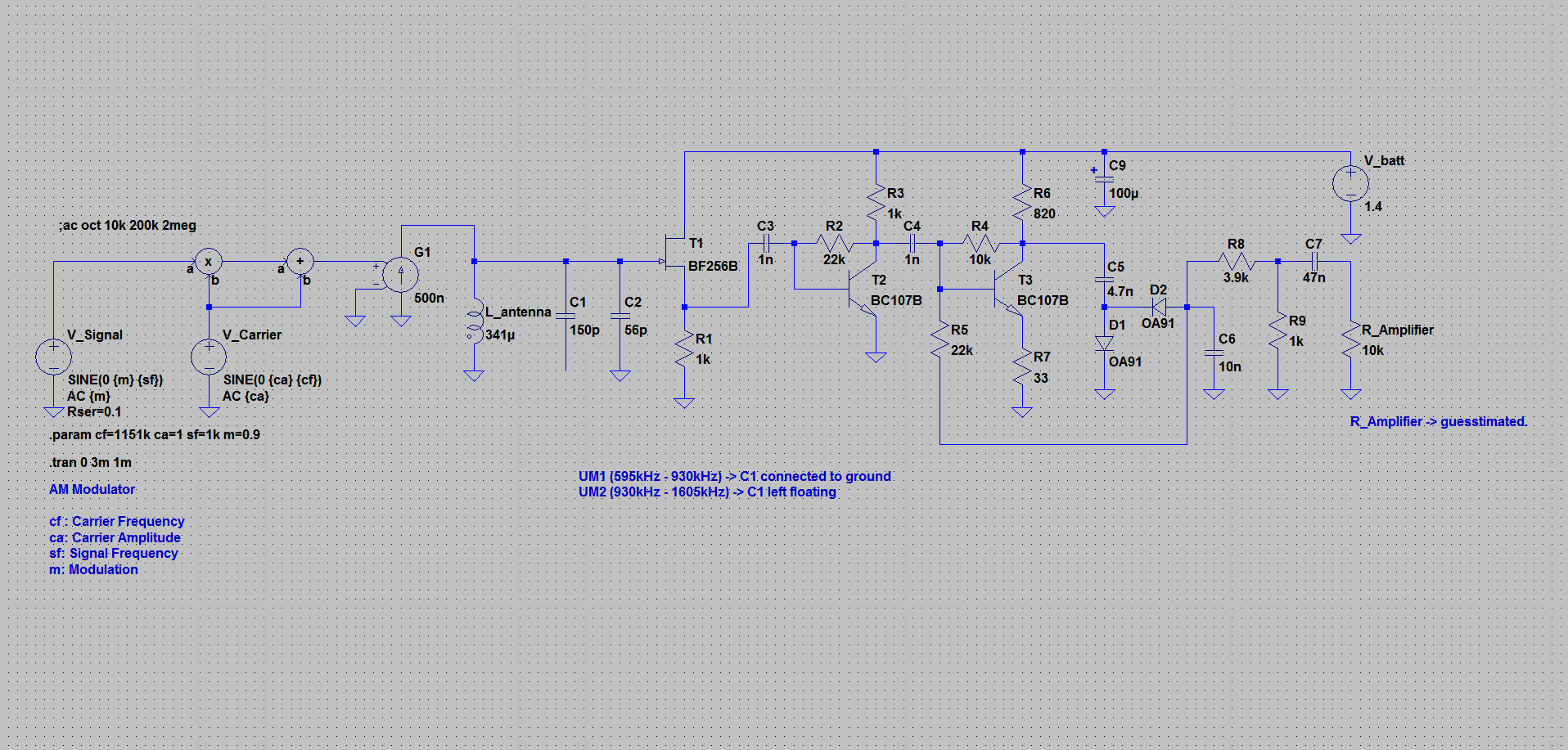 Simulation works fine (I chose 1151kHz frequency, to be in the UM2 range, just with C2 connected). Voltages seemed close to the schematic indicated ones. At least now I had a reference to cross-check against, without a second working radio.