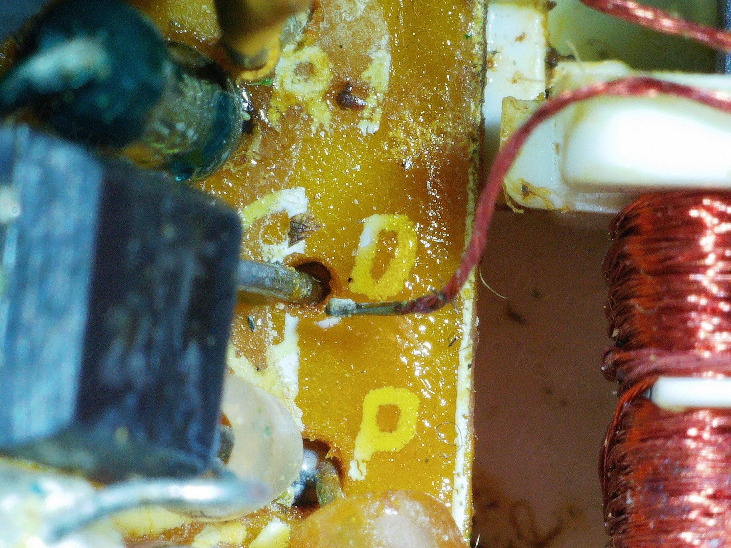 Now that the inductor was more robust, I felt a bit more comfortable re-attaching the to the radio to do some tests. But where to attach it ? The initial disconnected end was close to one pin of a transistor, but was it really where it should have been ? Using Gimp, and a lot of back and forth between schematics and the board, I managed to shine some light into the crowded space: