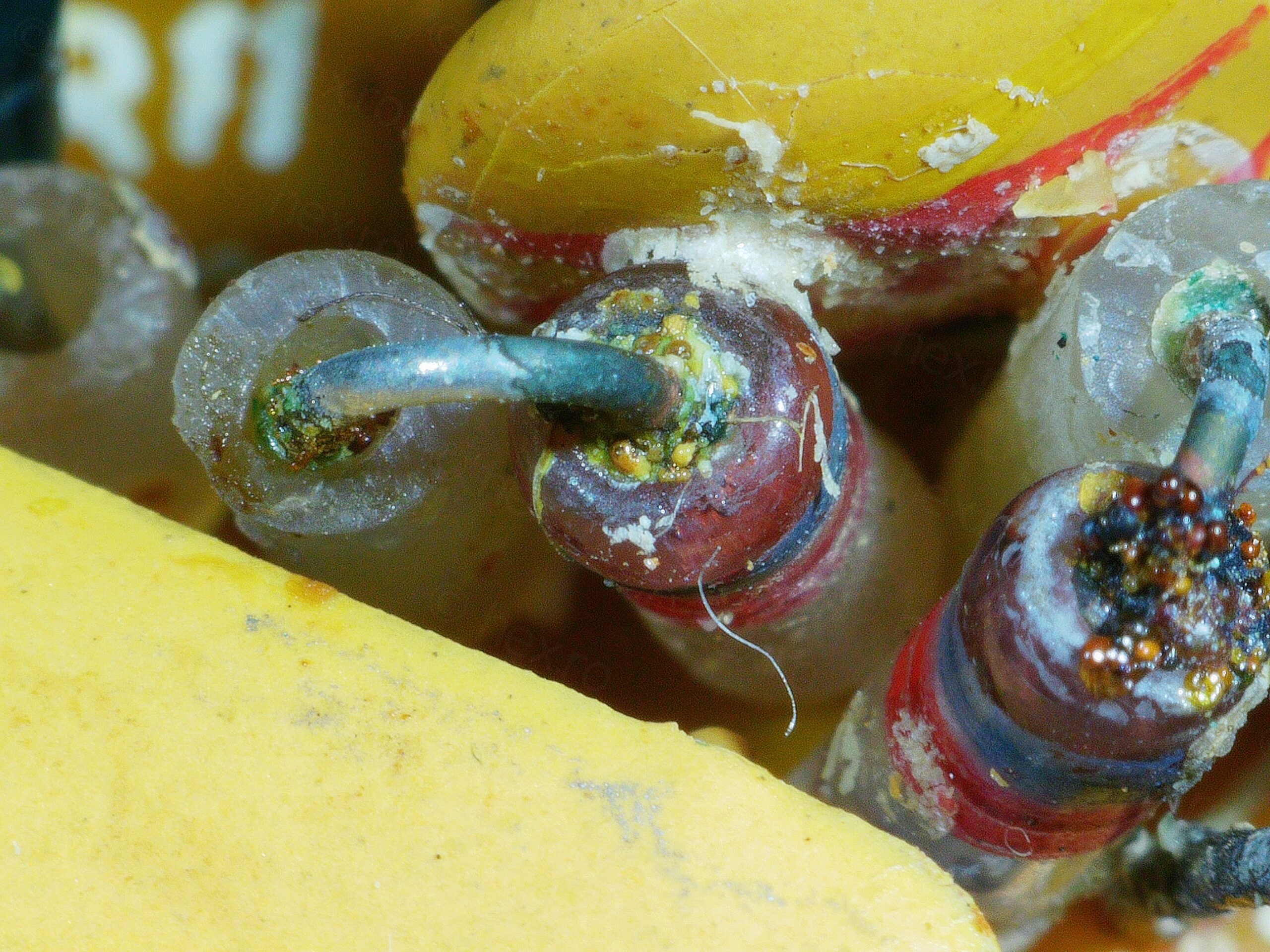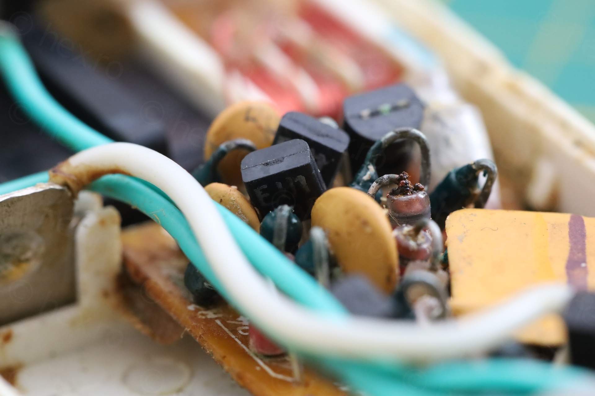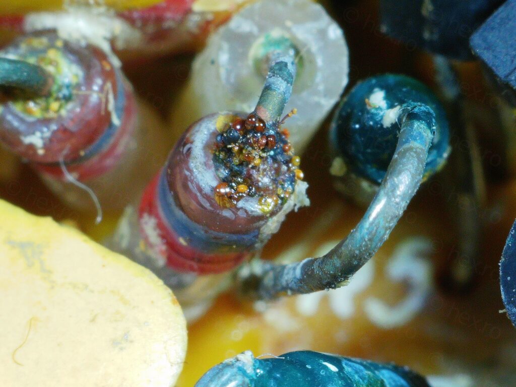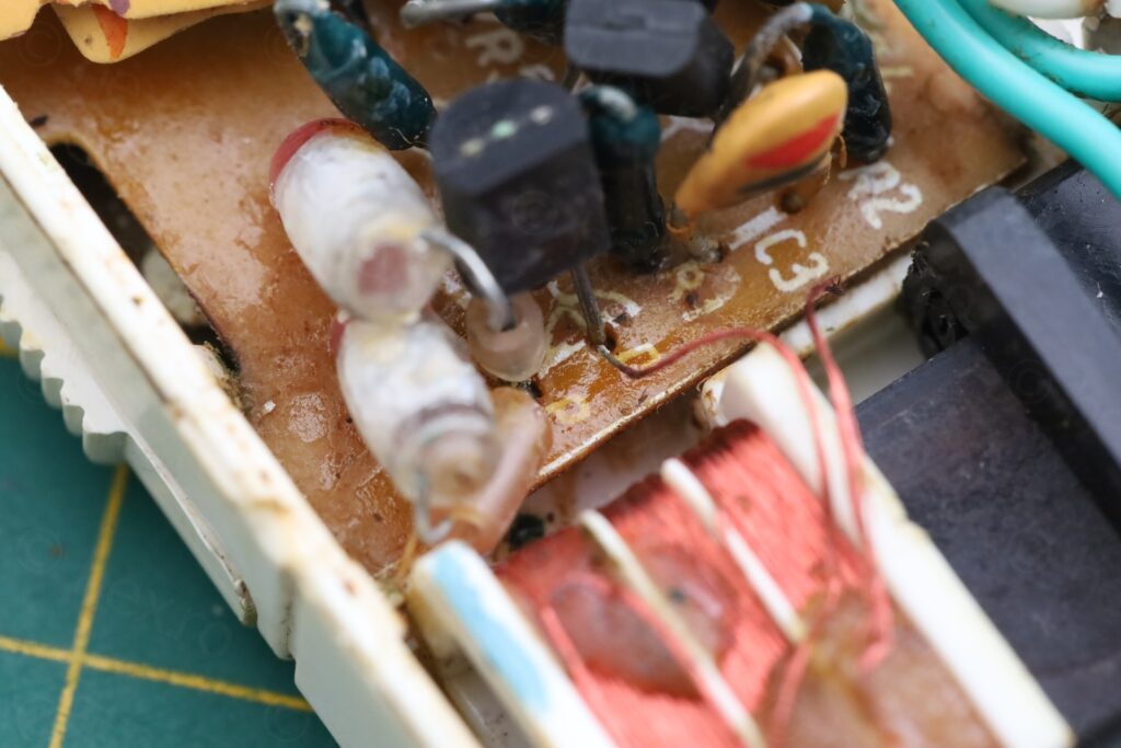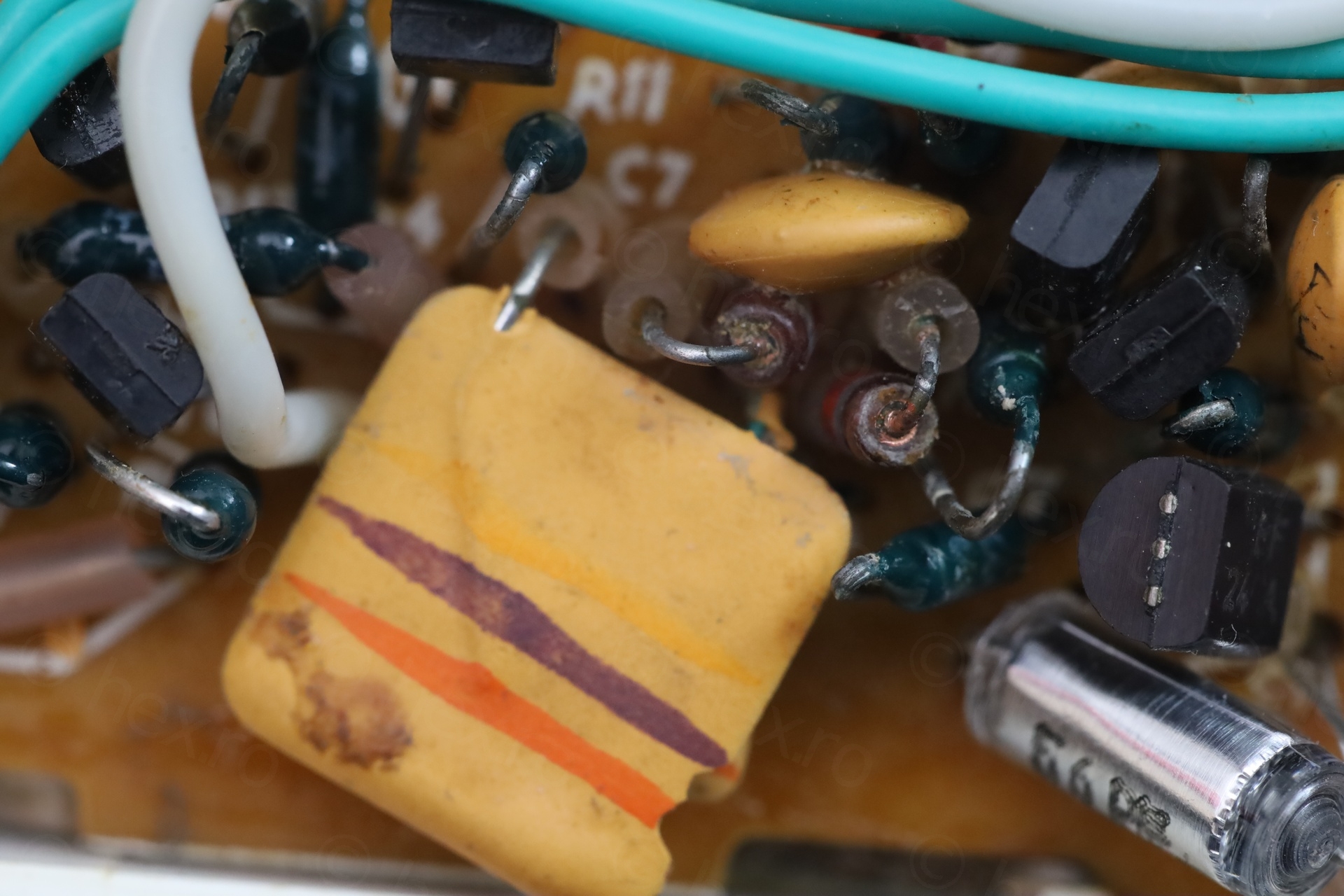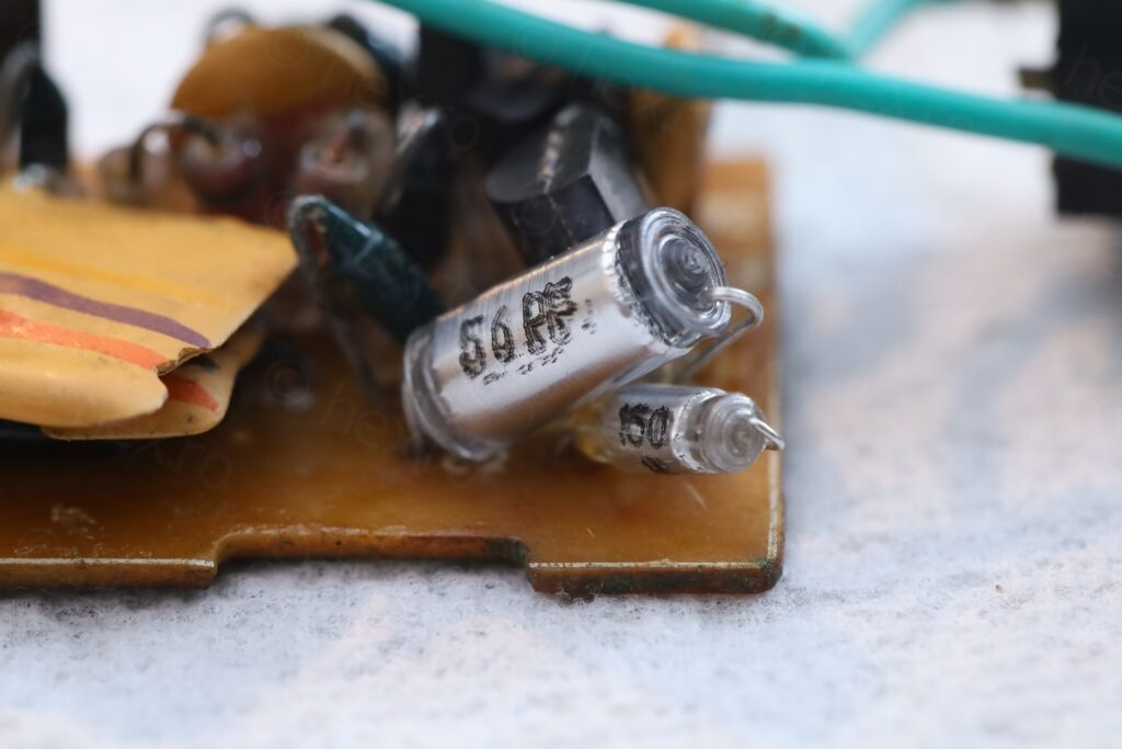 - Two polyester capacitors were cracked, corroded and with missing markings.