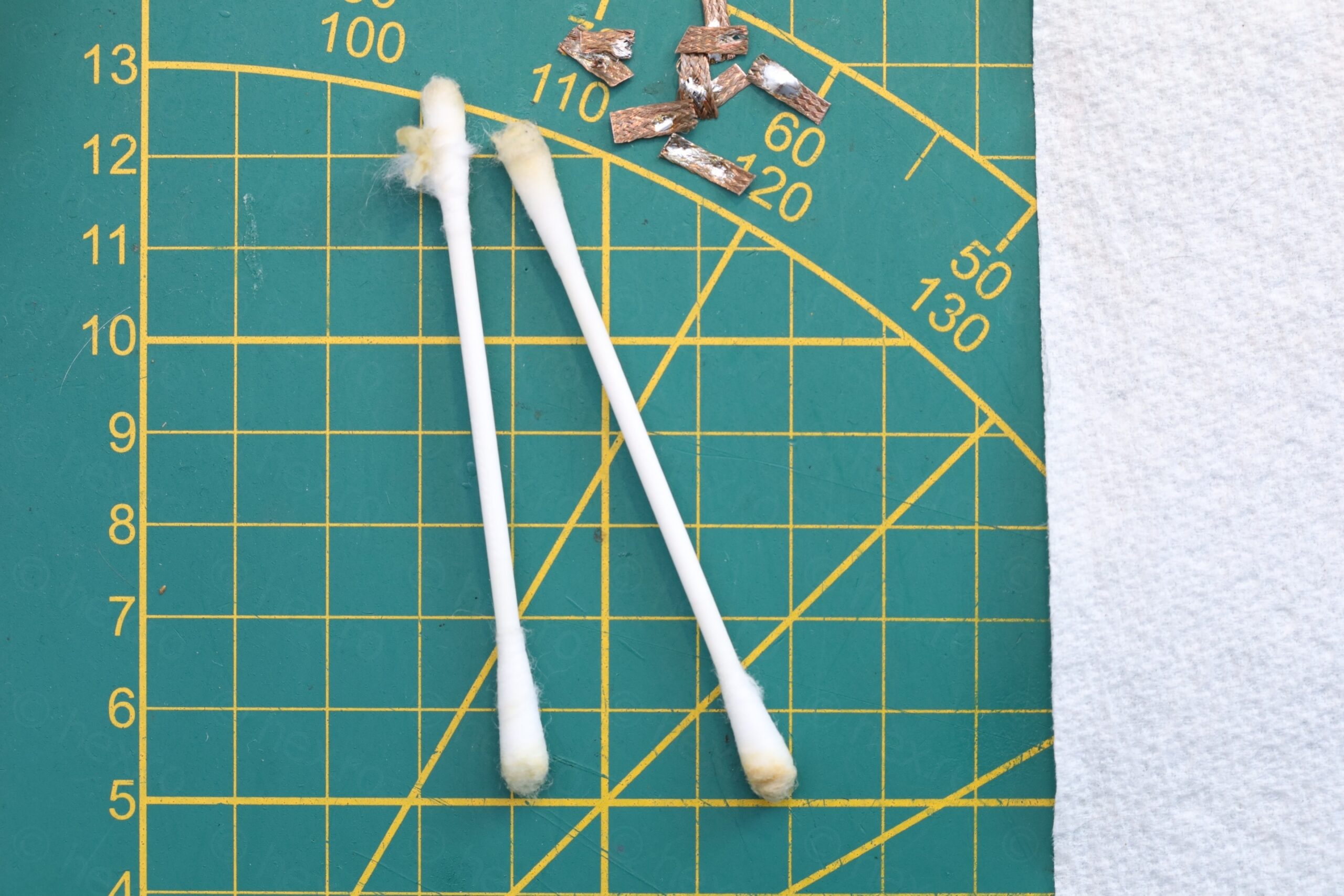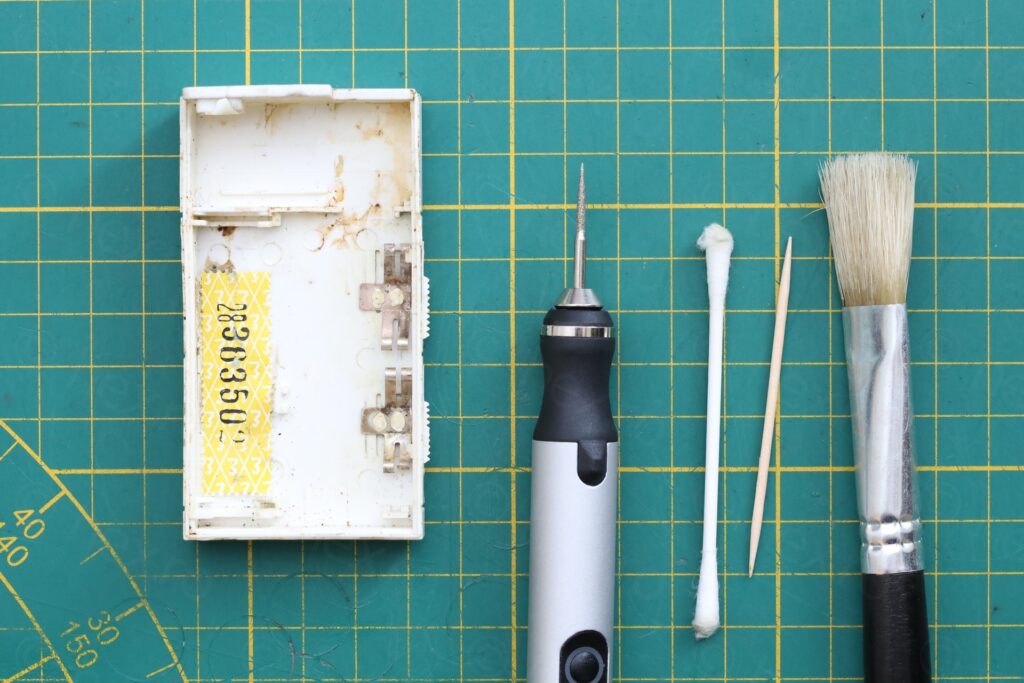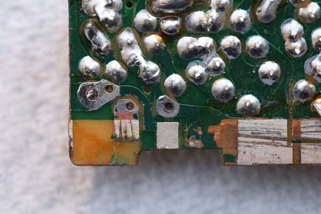 While waiting for the new capacitors to arrive, I figured I should take care of the corrosion. This boiled down to use a grinding pen with a very fine tip and going around the green deposits, never dwelling too much on one spot, and cleaning with a brush as well as with IPA: