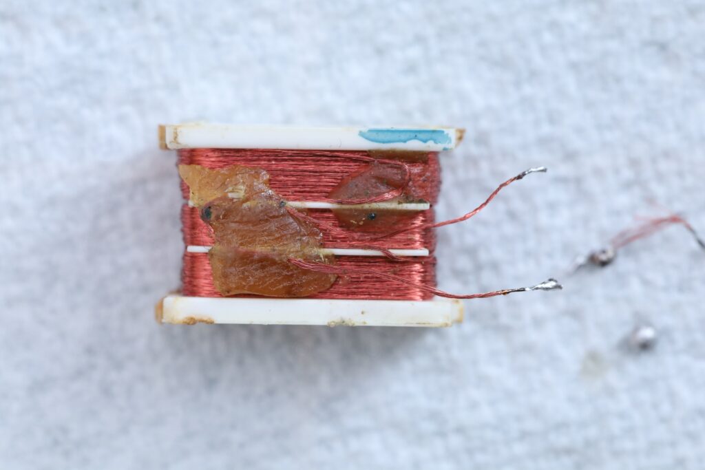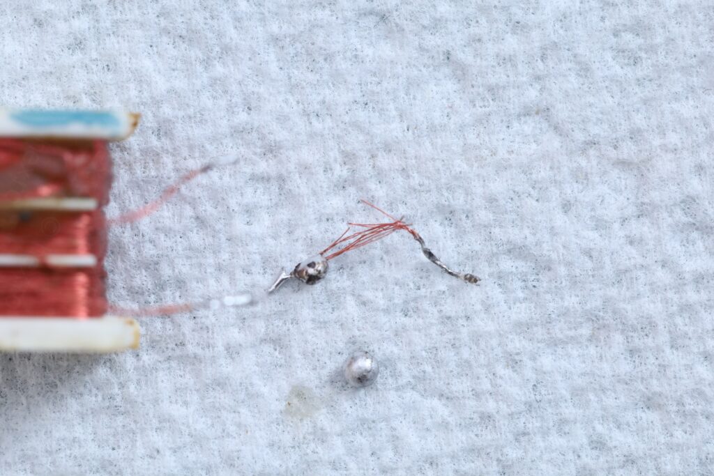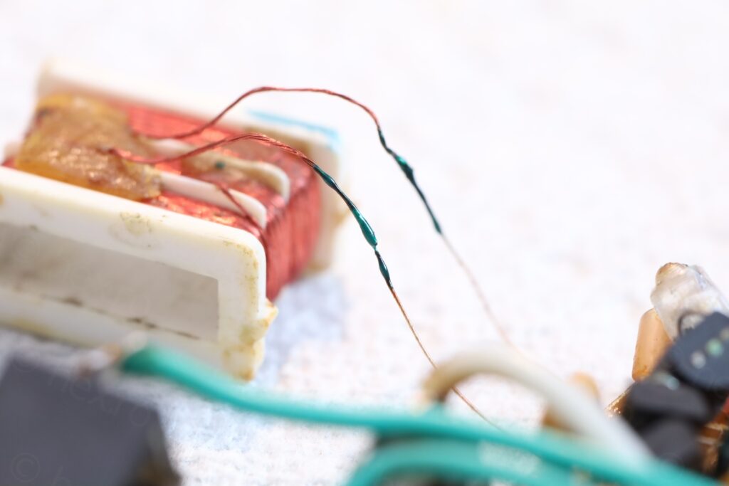 I devised a plan: use some enamel wire salvaged from an old inductor to make short “extensions” for the cables. I trimmed the frayed ends carefully so that each strand of the Litz wire could be soldered. Then I applied a thin coat of UV‑conformal paint, followed by a few drops of melted paraffin wax, to stop any further fraying.
