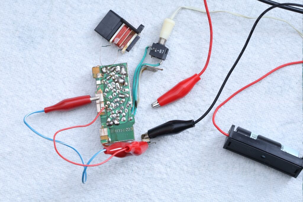 The radio Volume button connects the battery ground to the rest of the circuit. I had to use some crocodile leads to bring the ground where it should. This way circuit board could still be probed, without having to have it inside the radio: