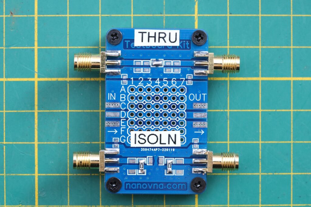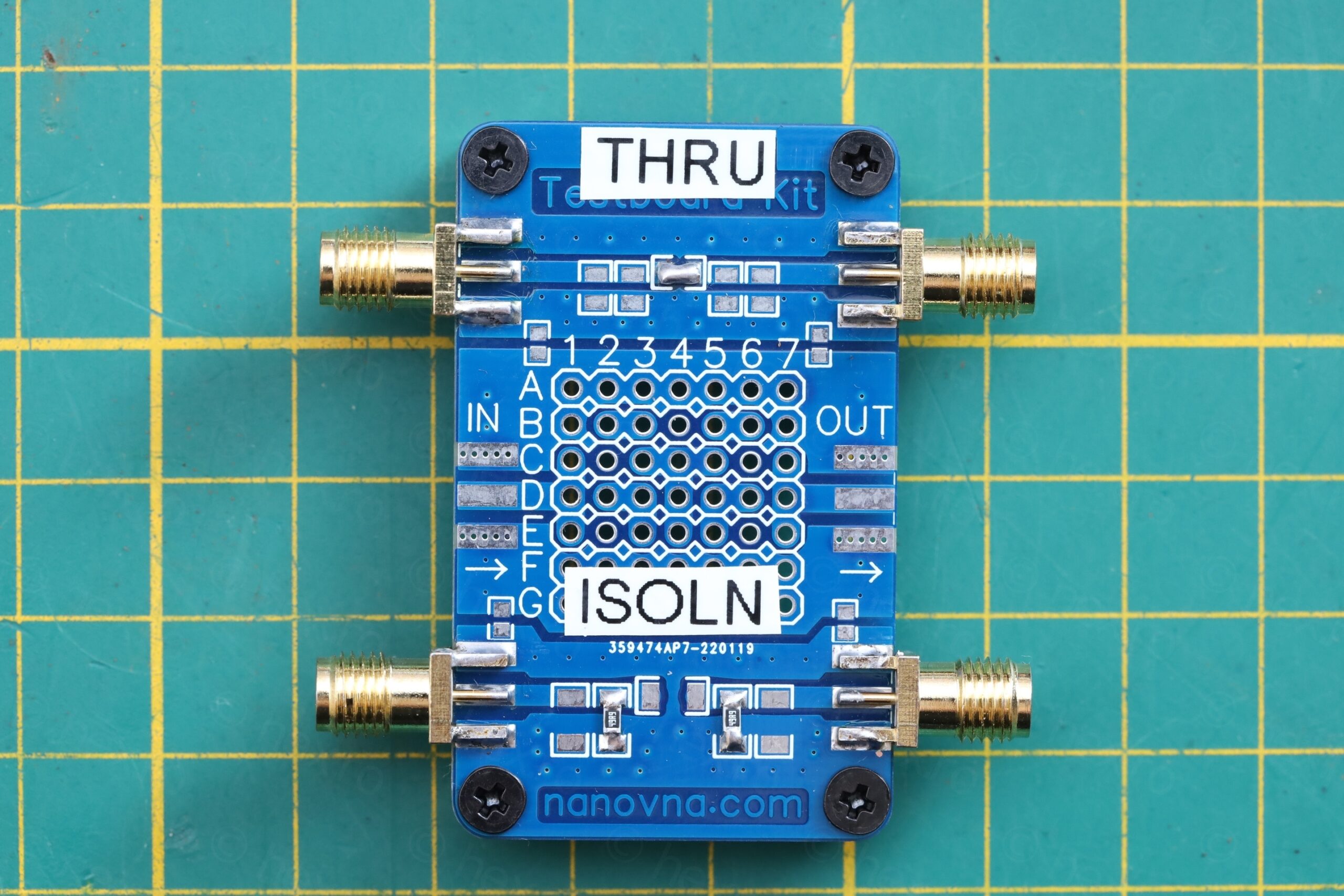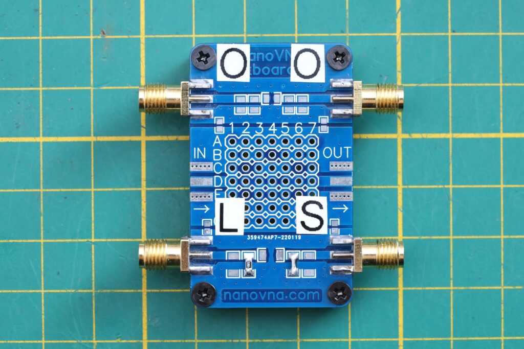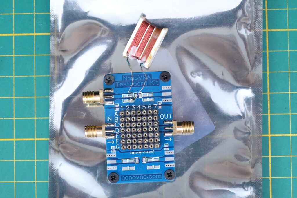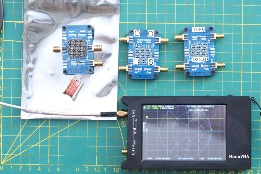 But once I had the inductor fixed, I could now characterize it using the NanoVNA, as I wasn’t afraid to solder it anymore. There are these kit boards to measure parts, made for NanoVNA and one would hope the boards all have the same RF characteristics. I chose the pads where I’d solder the inductor, proceeded to create two SLOT standards, then soldered the antenna onto the respective pads on the third board. Now I was able to calibrate the NanoVNA: