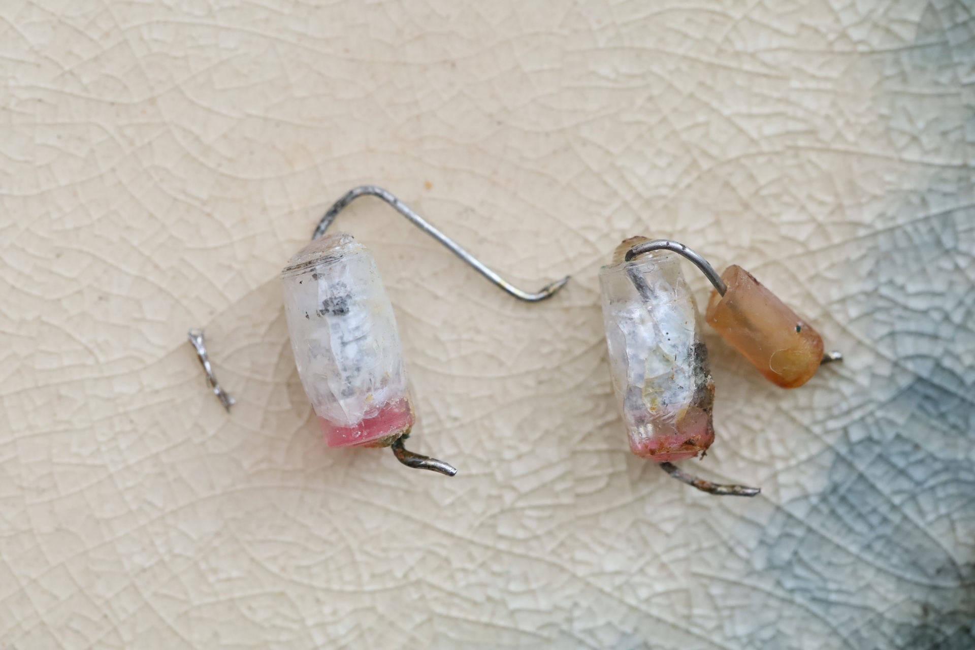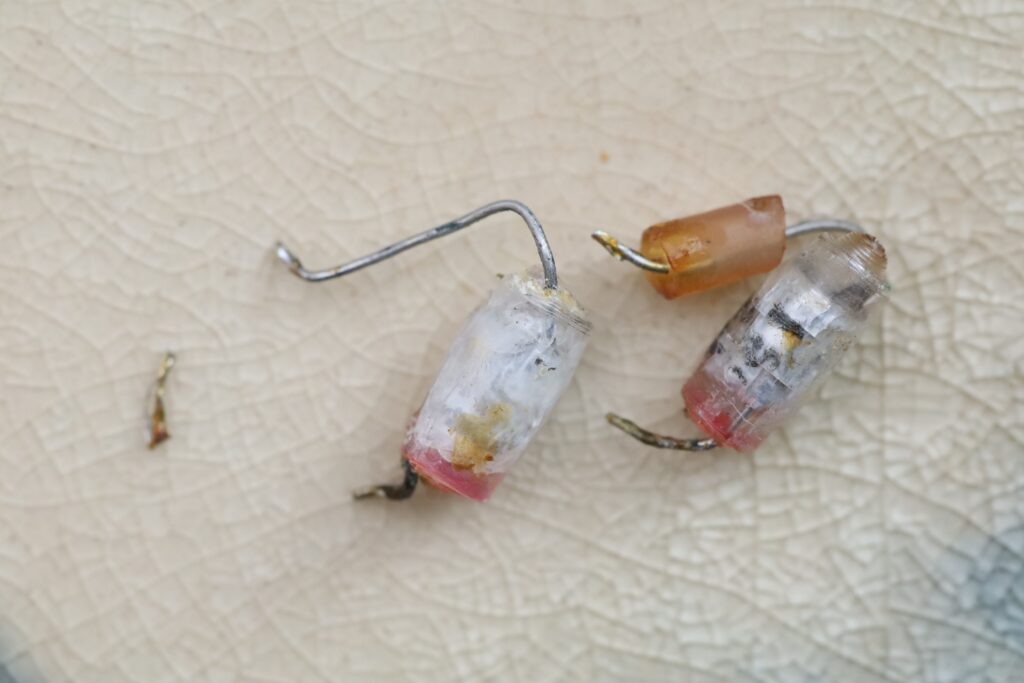 - Germanium diodes had weird brown metallic bubbly deposits where the leads were entering the glass body.