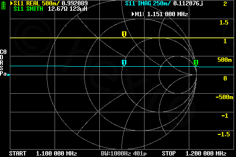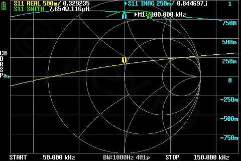 First results, Peak Atlas LCR40 is good, at 100kHz (left), NanoVNA reports 7.65Ω and 116µH. At 1151kHz (the random chosen frequency), the antenna measures 123µH and12.6Ω: