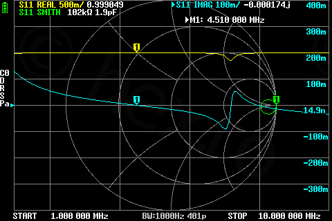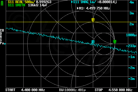 Out of curiosity, I did a wider scan, just to see the antenna self-resonant frequency, and it turns out to be at 4.5 MHz: