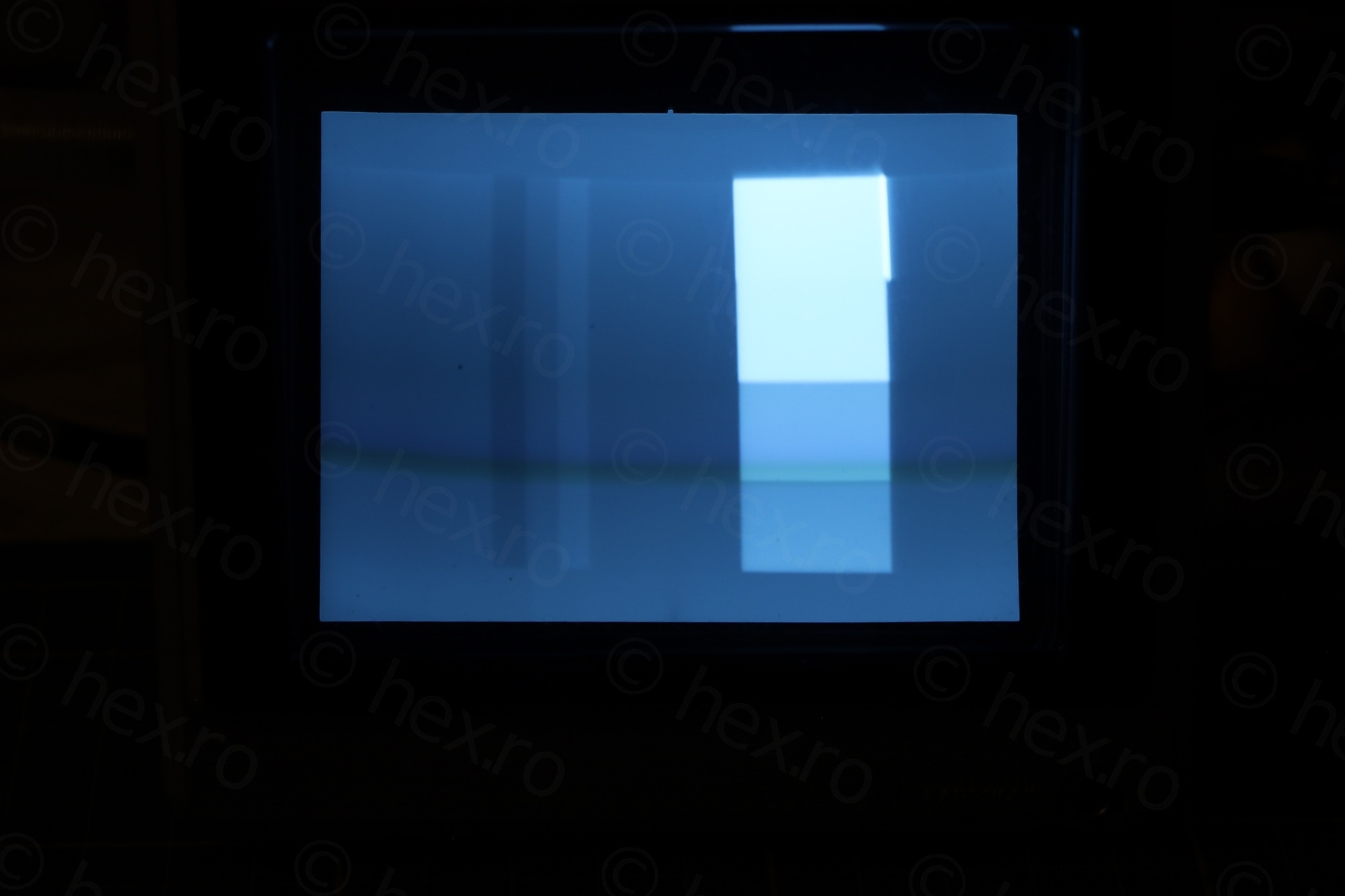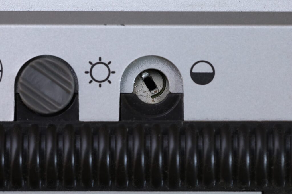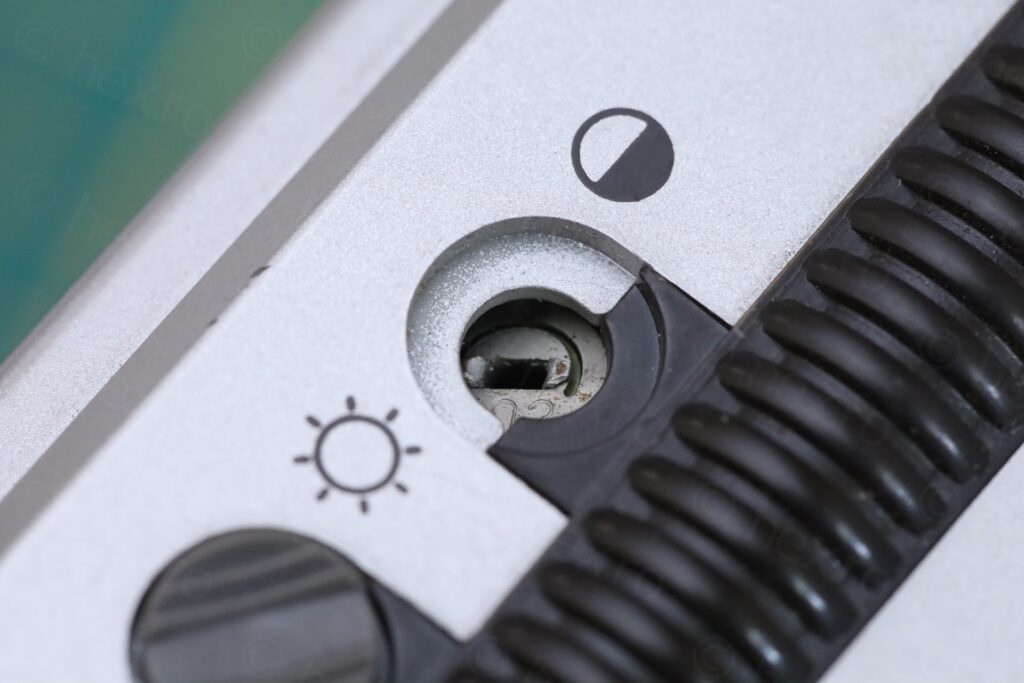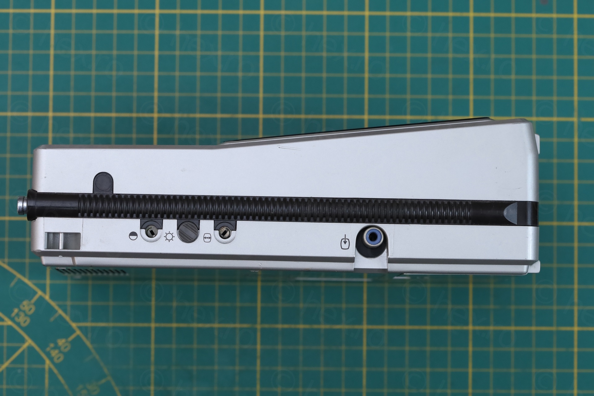 On a closer look – only the brightness knob was still present. The Video IN jack was “off-center”. A dislodged piece of white plastic bit was stuck in between the dial pointer and the see through lens.