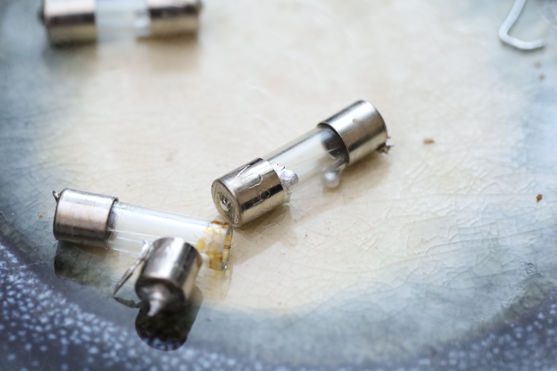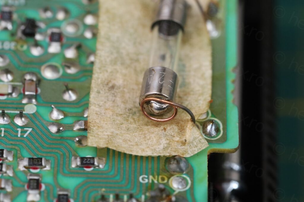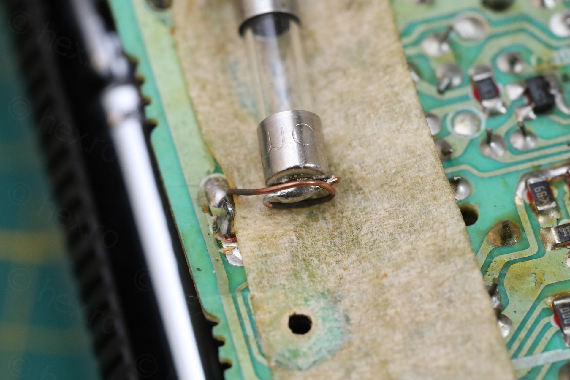 This proved very annoying. I couldn’t even get the cap hot enough to solder one lead, that a small noise was heard accompanied by solder coming out from inside the fuse! It took 3 attempts before I realized I have a problem. First, I didn’t even notice some solder was ‘ejected’ from inside the fuse, on the glass. Second, I spotted solder while trying to solder – it was confusing, where did it come from, it could not have been the one I was putting. The 3rd attempt, the glass body just de-glued itself from the cap. It was time to stop and think.