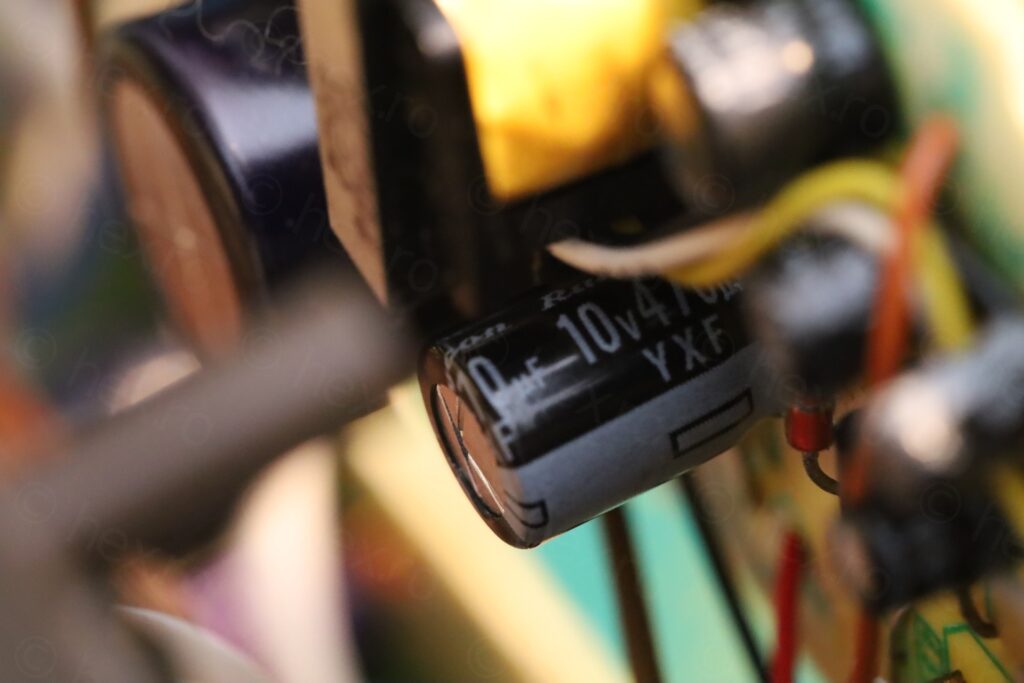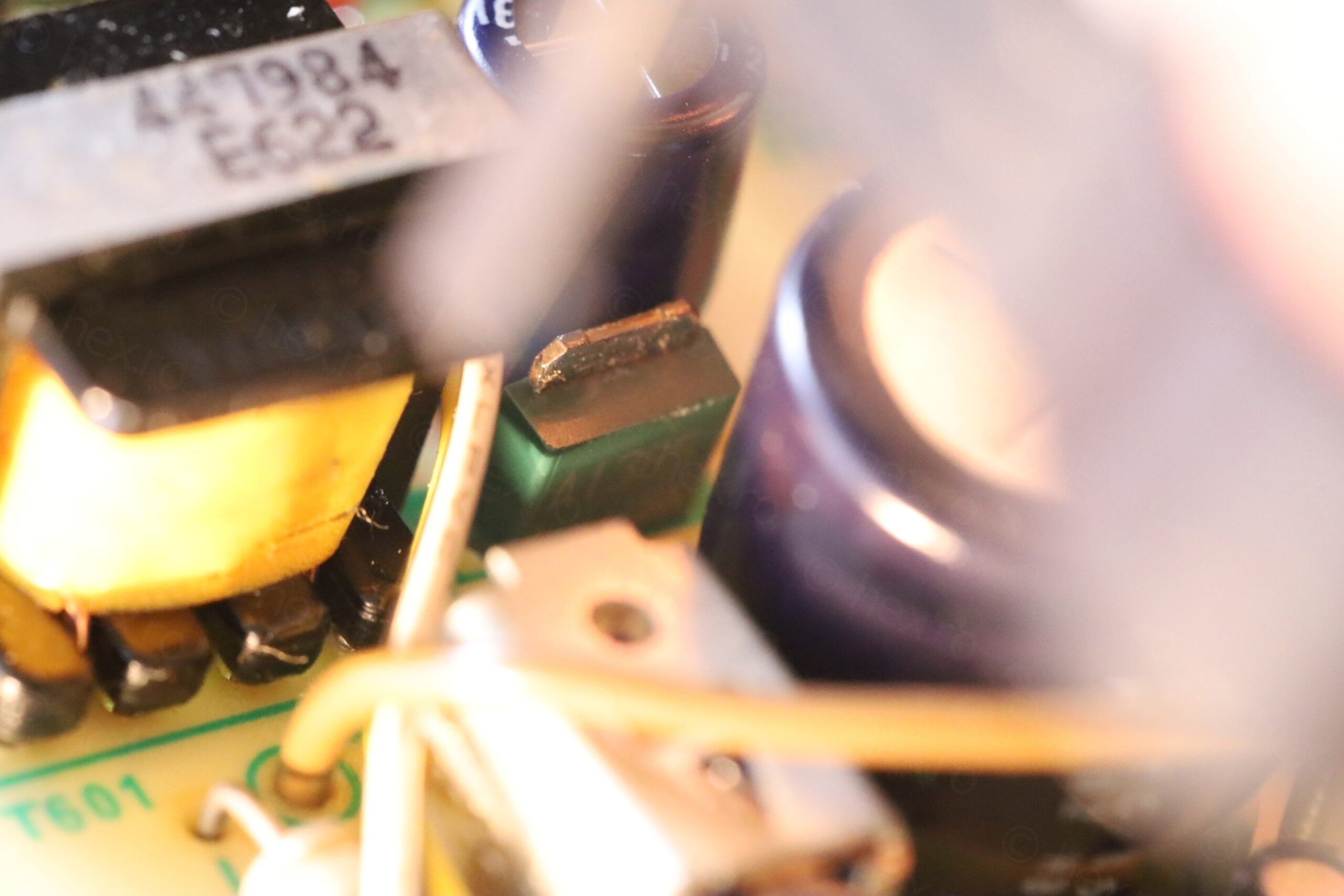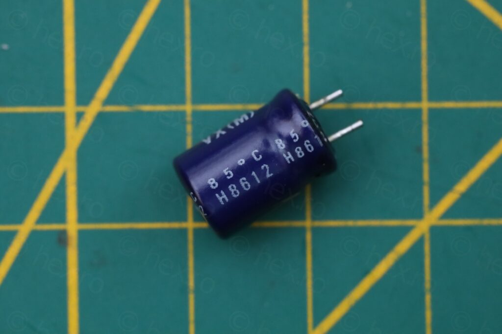 The capacitor is from a reputable brand – and, not surprisingly, after the short went away, it was now showing good ESR, albeit at a lower capacity (364µF vs 470µF). I replaced it with another reputable brand capacitor that I had. The replacement is rated for 6000hours @ 105 °C so it should endure better the heat from Q603 than the old one which was rated at 85 °C: