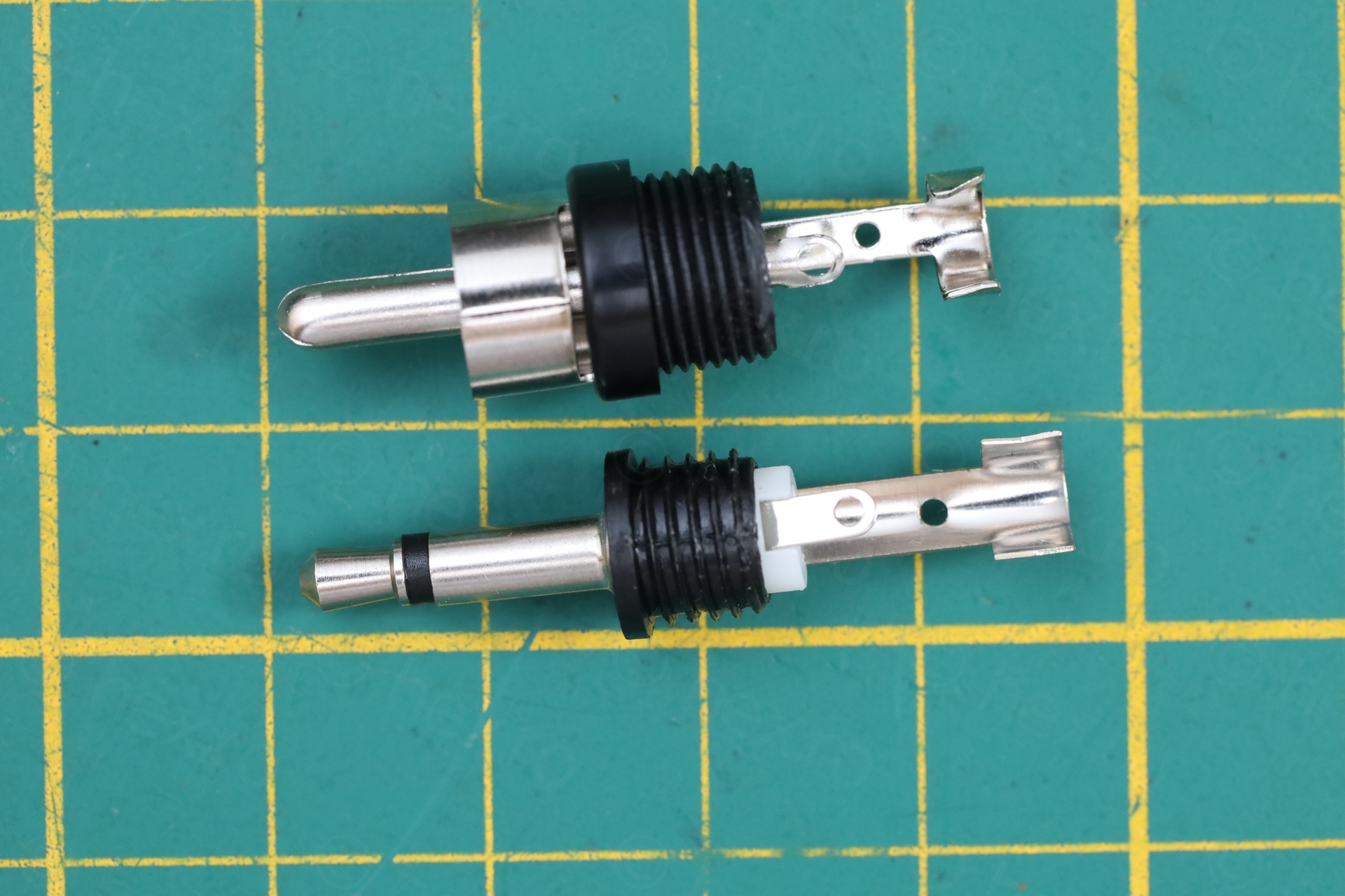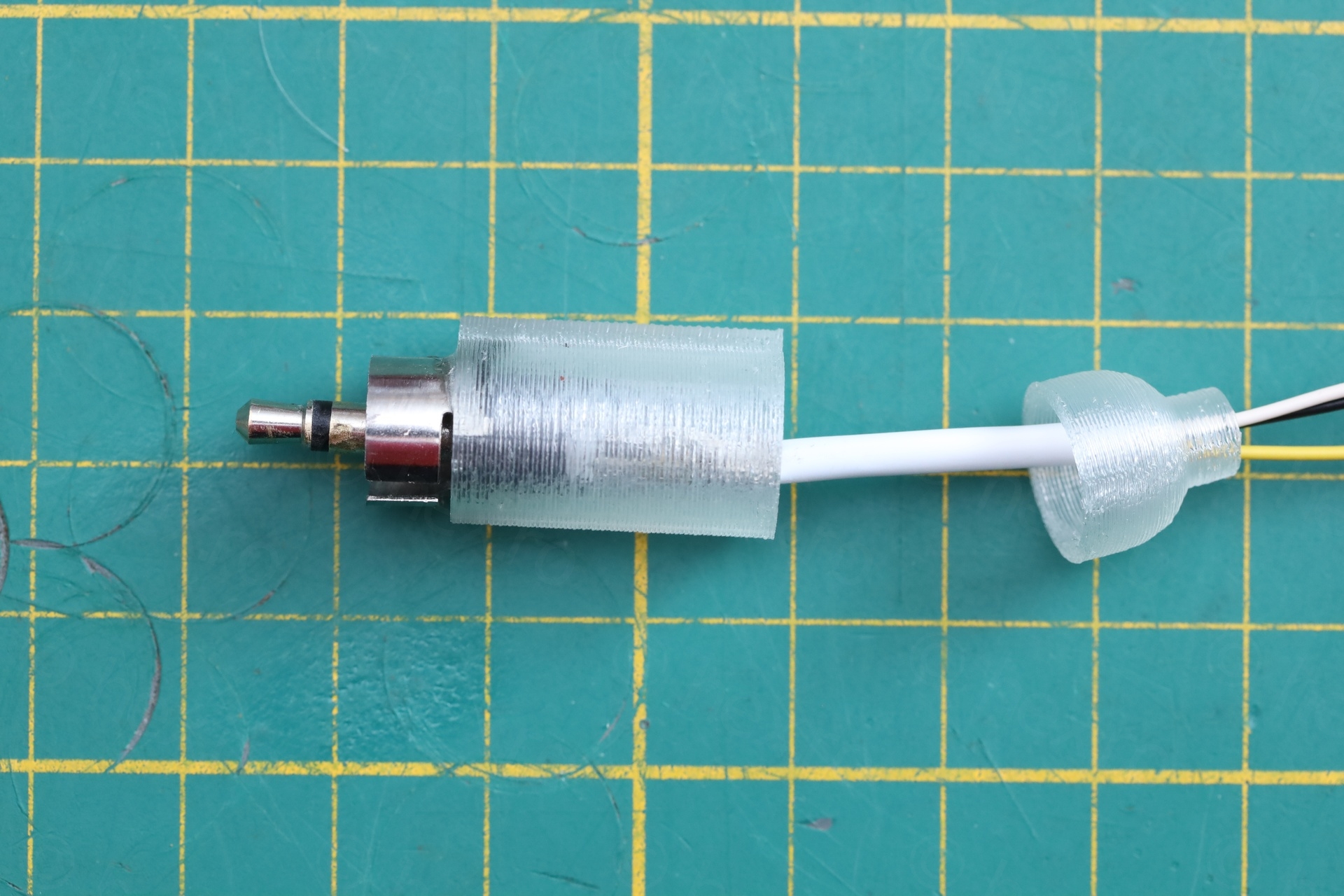 - Centering and gluing the RCA ring around 3.5mm jack, was done with the help of a 3D printed part that I designed in FreeCAD. This allowed me to glue both the RCA ground ring as well as the jack and keep them securely in place.